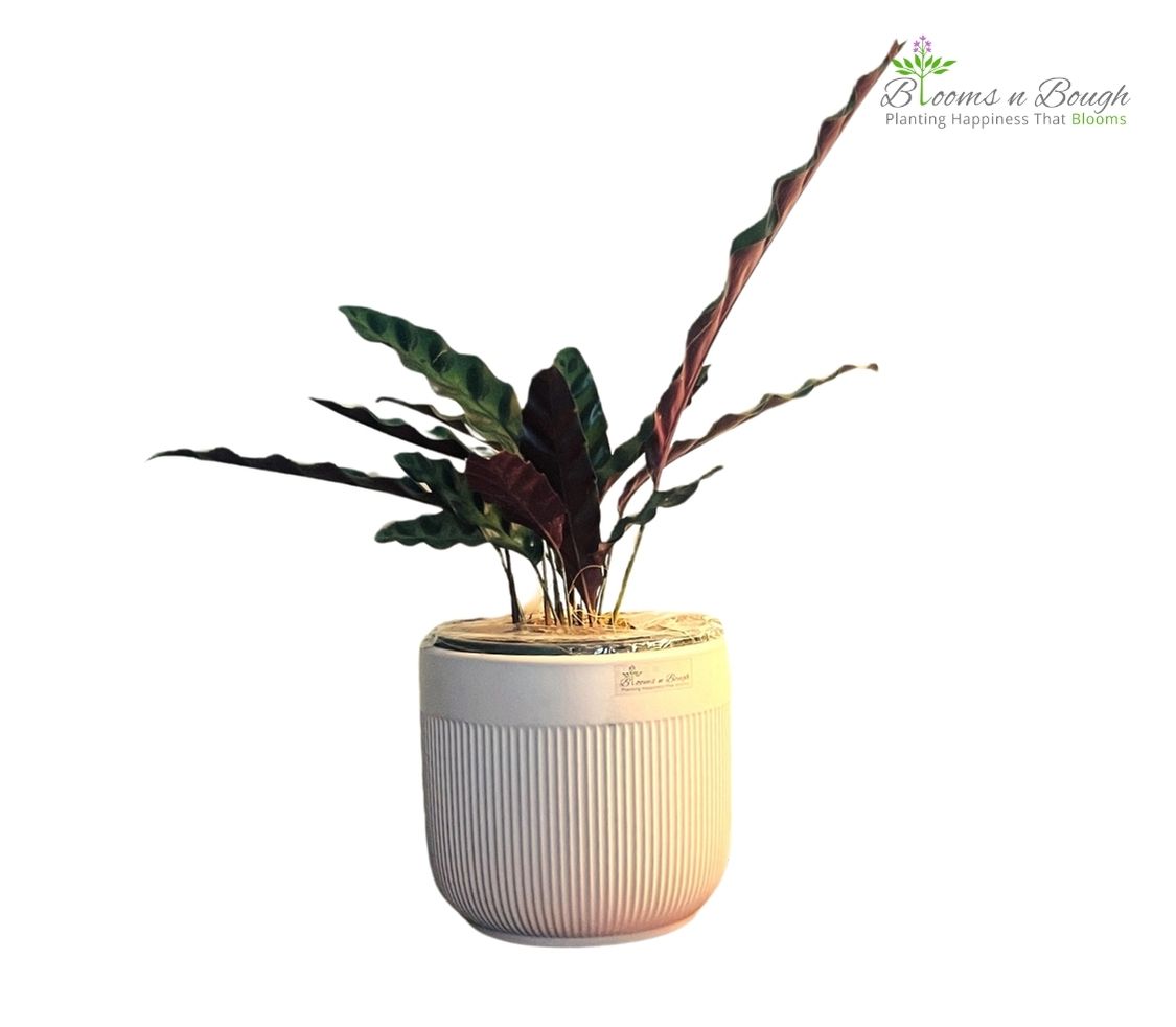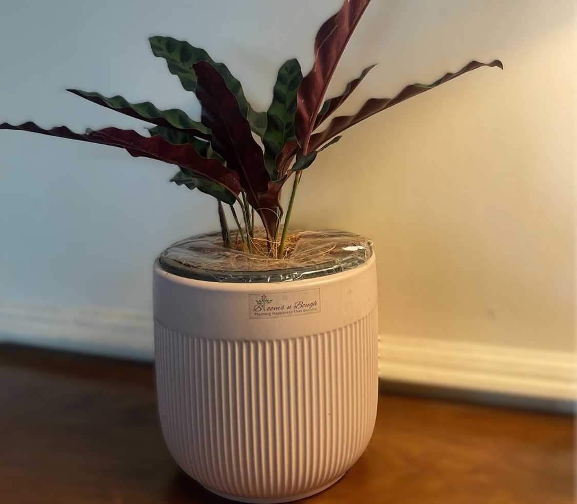 This plant comes pre-potted in a breathable plastic grow pot, nestled within the premium ribbed terracotta planter. The growing medium used is specially curated for Calathea species—well-aerated, moisture-retentive, and rich in organic content—to ensure optimal health and root development. The inner grow pot can be easily removed for watering or maintenance without disturbing the elegant terracotta planter, making indoor plant care effortless while preserving your decor’s aesthetic appeal.